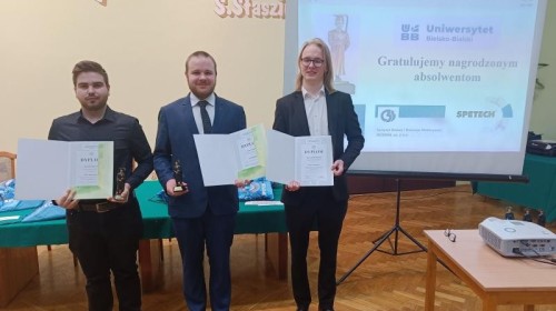 Wyróżnienia finalistów w tej samej kategorii otrzymali: KONRAD BOJDYS, JAKUB MRZYK i FILIP KACZMARCZYK. Nasi laureaci osobiście odbierali nagrody i dyplomy. Na uroczystej gali w siedzibie NOT w Bielsku-Białej towarzyszyli im wicedyrektor ZSSiO Jan Marek wraz z wychowawcą Sławomirem Szęszołem.